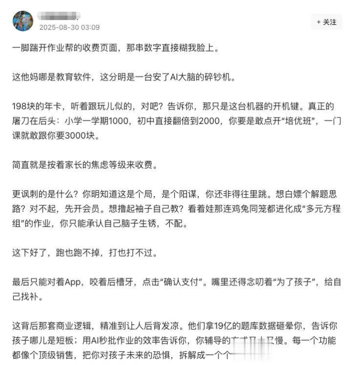 正如网友总结的,作业帮的学习机和App,都是利用家长和学生的教育焦虑,无论你是否购买服务,他们都会用各种营销手段让你花更多的钱,利用家长“为了孩子”的心理,最终有不少家长只能妥协,买越来越多的课。